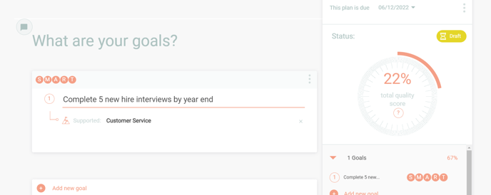 WorkCompass will help you to set SMART goals using our artificial intelligence tool. The tool and will read what you write and advise you on how you can make your goals smarter. If all letters (SMART) on your goal are lit up, then it means you created a SMART goal.