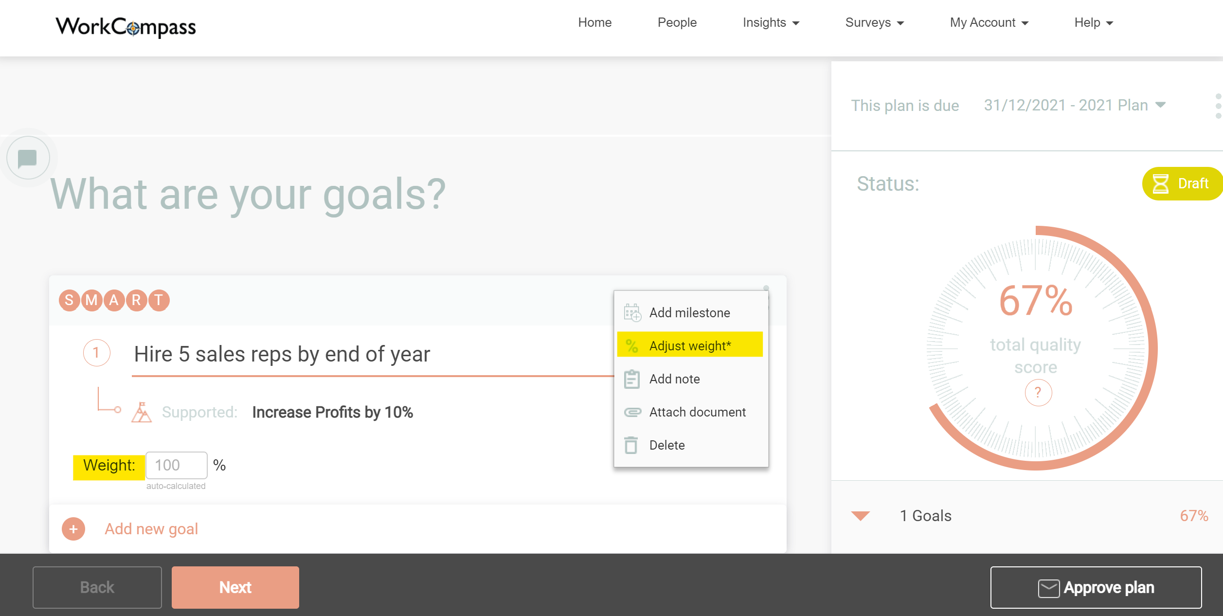 3. Click on Adjust weight to adjust the weighting of the individual goal.