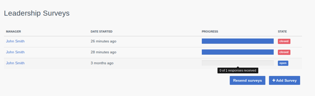 - You will be able to see how many responses you have received by clicking on Surveys, then clicking on Manage leadership survey.