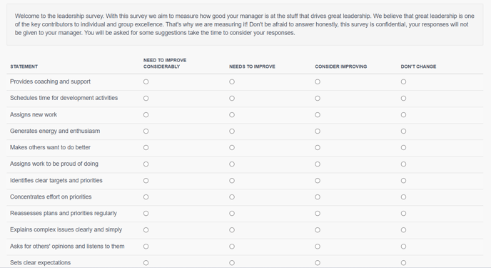 Leadership surveys give teams the opportunity to provide feedback for their managers/supervisors. They can highlight behaviours, ways of working, things they should be doing more or less. Managers can then commit to improvement initiatives based on the feedback provided by their teams. These can be an invaluable tool for both managers and leadership levels.