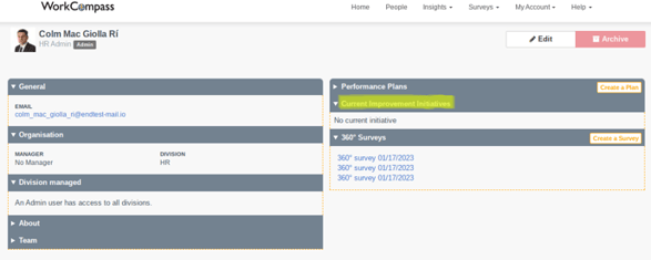 Once the Manager has committed to the improvement initiatives , they will be brought to the profile page where they can see them under the Current Improvement Initiatives section.