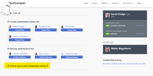 In order to see the results, Managers can click Follow up on your leadership survey on their Home page as highlighted below.