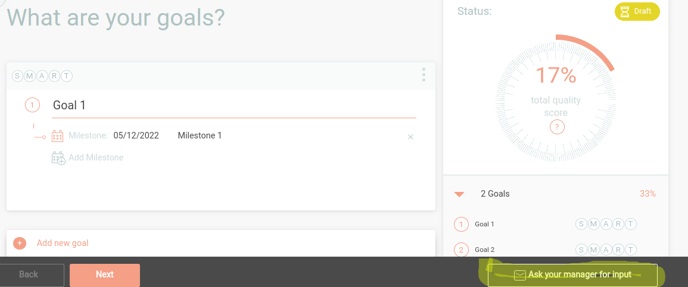 3. After adding the milestones and selecting the due dates, you then need to click on the “Ask your Manager for Input” button to let your manager know that they’ve been added to your plan.