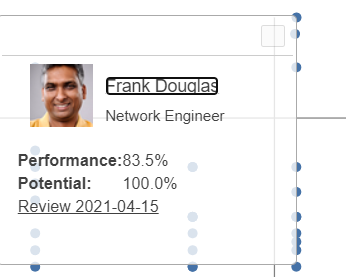 By clicking on an employee's data point in the quadrant, you can view their profile details and see the percentage of their most recent completed performance review.